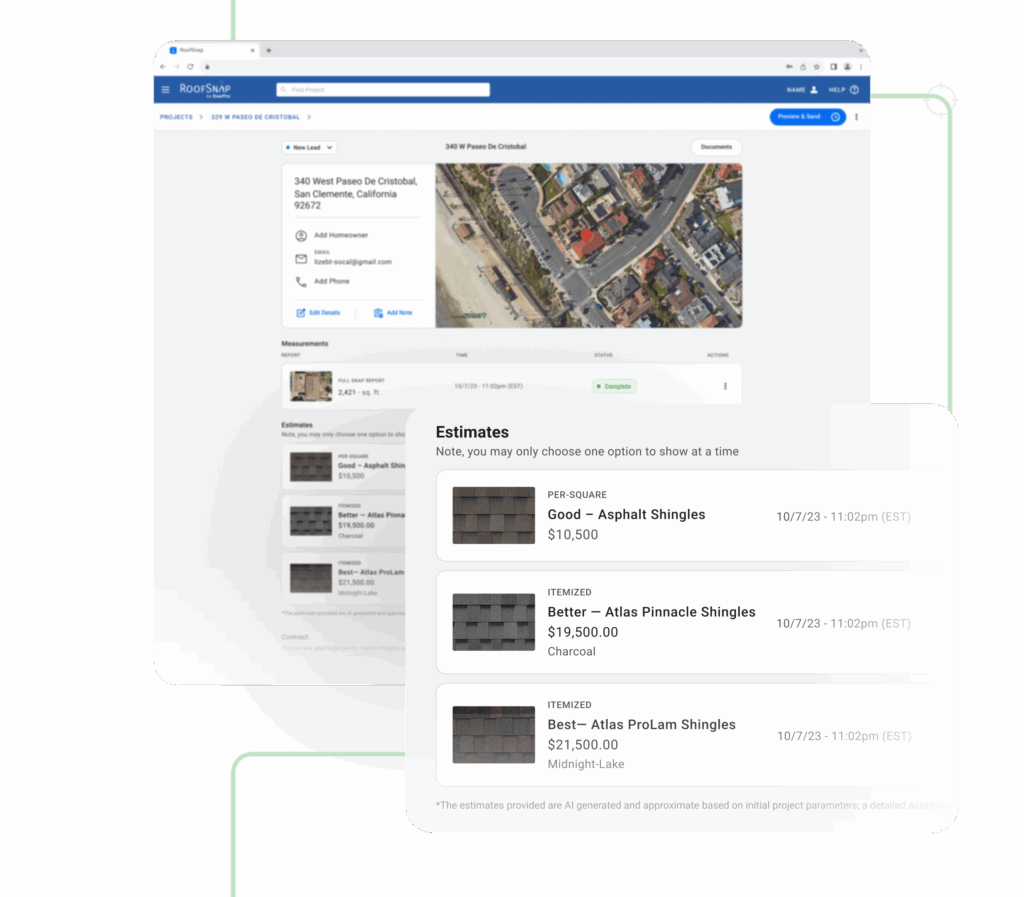 RoofSnap’s Estimation Suite lets small crews build professional estimates in minutes. Instant Estimates let you quickly generate Good, Better, Best pricing based on your materials and measurements, helping you pre-qualify leads and quote jobs on the spot.